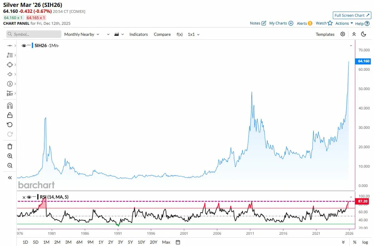 Silver’s monthly RSI hit 87.28 this week. That puts it alongside the most extreme readings in modern history - the Hunt Brothers’ attempted corner in 1980 and the COVID chaos in 2020. If we would be talking normal situations… short sellers would be all over this like sharks.