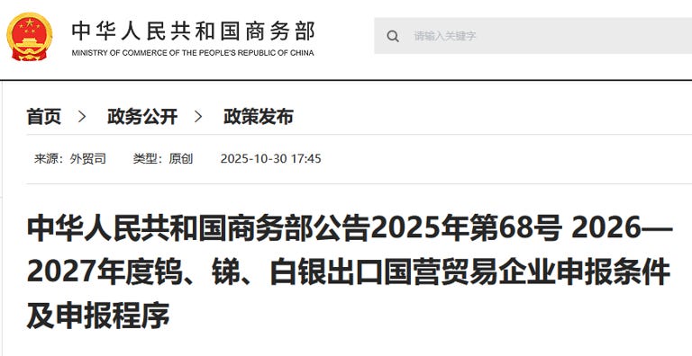 Next up: Dec 11: China’s Ministry of Commerce issued Announcement 2025-No. 68. Buried in bureaucratic language about “environmental protection and resource management” was a simple policy change: Starting January 1st, 2026, silver exports require state-trading licenses.