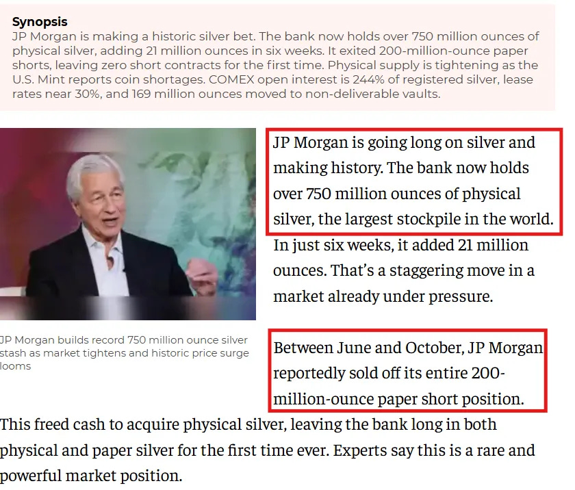 JP Morgan now holds over 750 million ounces of physical silver. At current prices, that’s north of $40 billion in metal. The largest private stockpile on the planet. They didn’t merely stop shorting. They flipped and became the world’s biggest long.