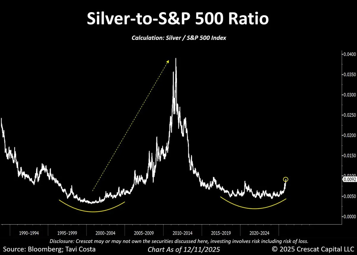 When silver led the last major bull market in the late 2000s, this ratio climbed from 0.005 to 0.04. That’s an 8x move. Silver didn’t just outperform stocks - it repriced its entire relationship to equities.