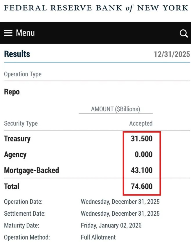 So while you were nursing your New Year’s hangover, the Federal Reserve was quietly injecting $74.6 billion into the banking system just to keep the lights on.