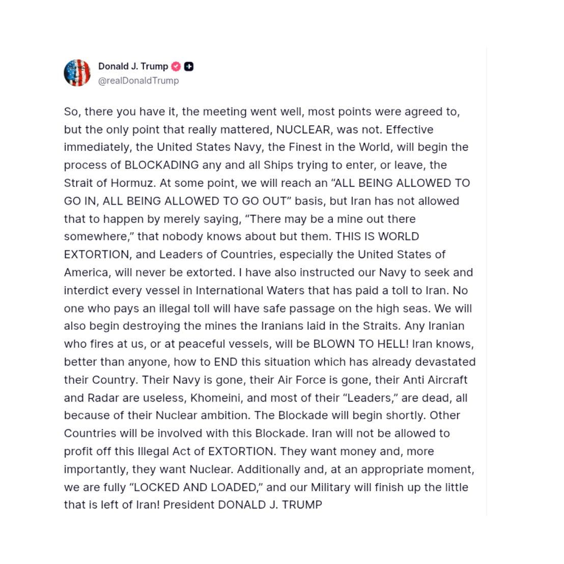 Trump posted on Truth Social that the US Navy would blockade “any and all Ships trying to enter, or leave, the Strait of Hormuz”. CENTCOM, as it does, translated the president’s rhetoric into something operationally coherent: the blockade applies to ships entering or exiting Iranian ports, not the entire strait. Ships heading to Dubai, Kuwait, Bahrain, Qatar - those are technically unaffected.
