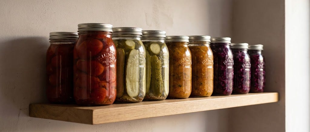 The goal is to come out of summer with a pantry that looks different from how it looked in spring. That’s the actual buffer. Not a single season’s fresh harvest - that’s gone by October. The preserved surplus is what stretches through winter, and winter is when supply chains get interesting.