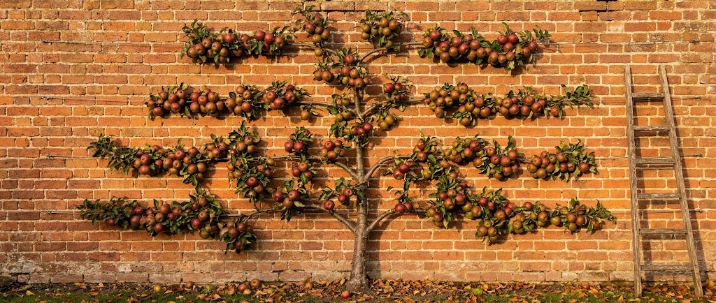 Dwarf rootstocks (M9 or M26 for apples) keep trees to 2-3 metres, manageable for a small garden, productive much earlier than standard trees, and suitable for training as espaliers - grown flat against a fence or wall, they take almost no lateral space, warm beautifully against brick, and yield surprisingly well. An espalier apple against a south-facing fence is one of the more elegant things you can do with an otherwise unused wall.