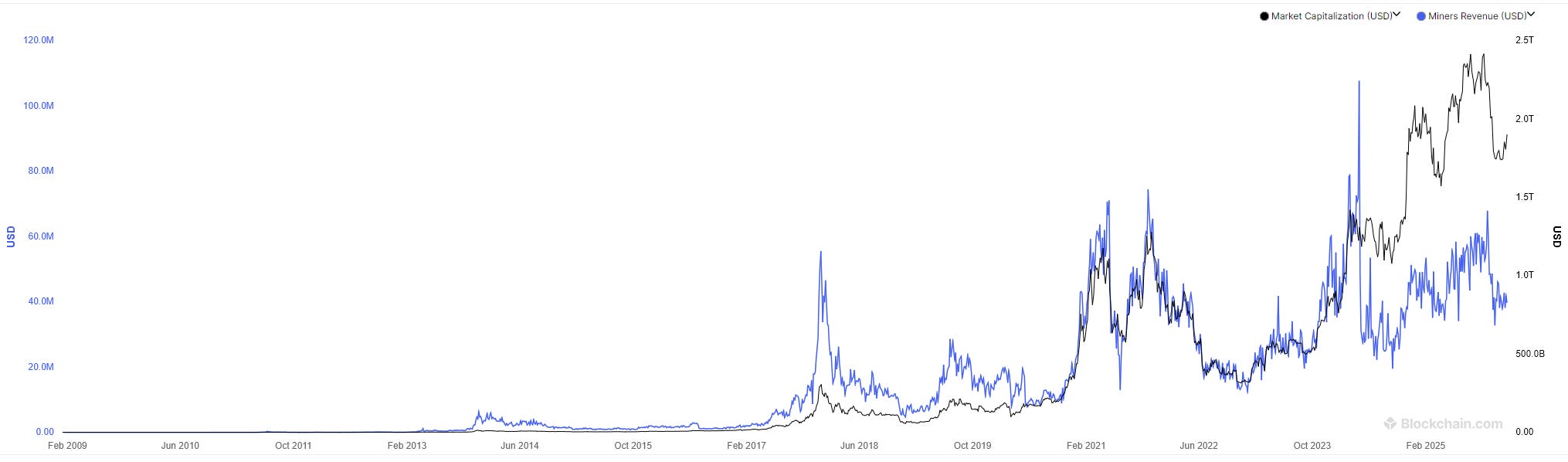 The security budget as a percentage of market cap is collapsing. As Bitcoin's market cap has grown into the trillions, miner revenue hasn't kept pace. The network is becoming exponentially cheaper to attack relative to its value.