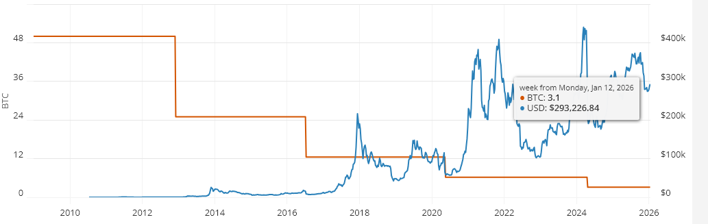 The block reward started at 50 BTC per block back in 2009. Every four years, it gets cut in half. This is the “halvening” that Bitcoin fans celebrate like some kind of religious event. 50 became 25 in 2012. Then 12.5 in 2016. Then 6.25 in 2020. Then 3.125 in 2024. Next halvening in 2028 drops it to 1.5625 BTC.