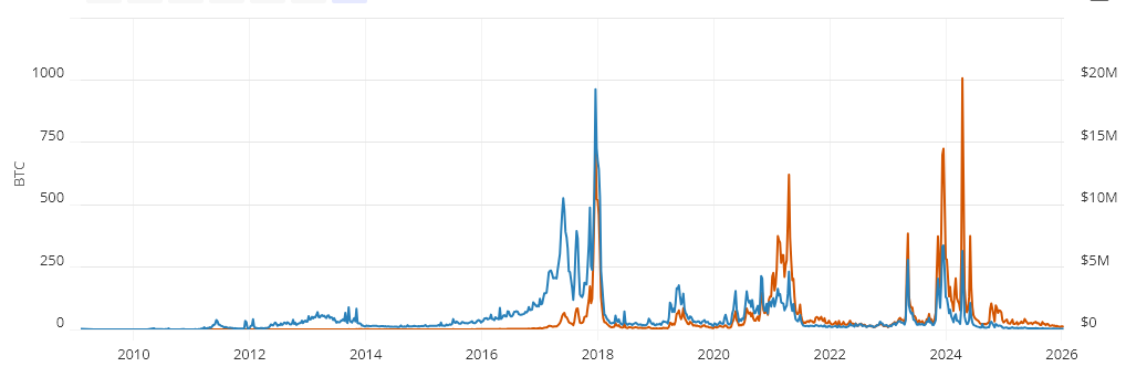 And that’s exactly what’s happening. Look at miner revenue vs BTC price graph above. It spikes during bull runs - around $70M in early 2021, then up to $107M during the 2024 rally. But these spikes don’t last. Revenue drops back down after each peak. Currently it’s around $50M despite Bitcoin trading at much higher prices than 2021.