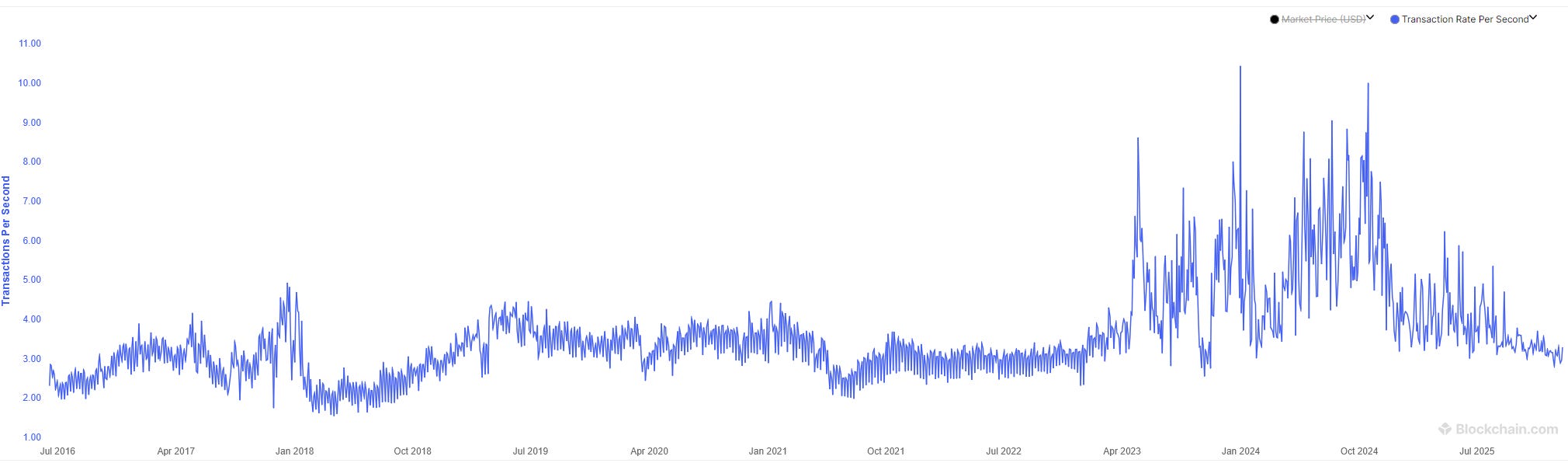 What remains is a network that can’t serve users, can’t generate fee revenue, can’t sustain its own security model. Seven transactions per second in a world where Visa processes 5,000 and competing blockchains do 10,000+.