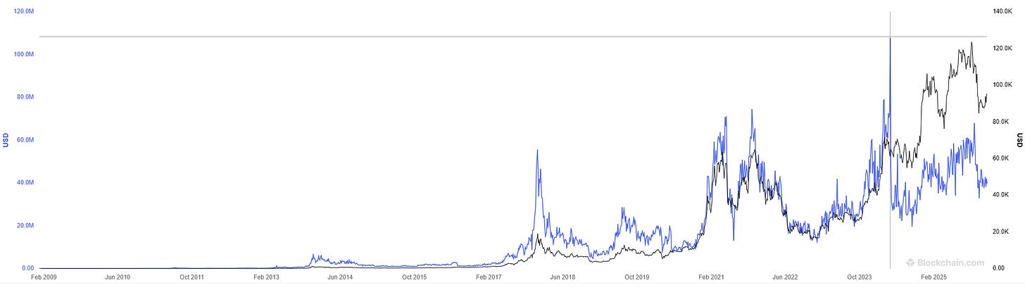 What most people don’t understand is that most Bitcoin aren’t even moving on-chain anymore. It’s sitting in cold storage for ETFs. BlackRock’s IBIT holds over $50 billion in bitcoin that never moves. Those coins generate zero transaction fees. Billions more sit on exchanges where people trade paper claims - again, zero on-chain fees. The actual number of on-chain transactions that could pay meaningful fees is tiny compared to Bitcoin’s total value.