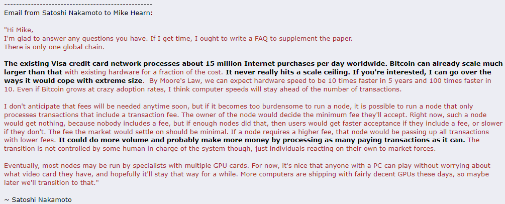 Satoshi Nakamoto explicitly planned for massive capacity increases. He wrote that Bitcoin could “already scale much larger than Visa with existing hardware for a fraction of the cost”. The original design anticipated billions of users, each paying small fees, generating massive aggregate revenue for miners.