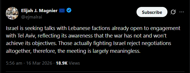 That has been coming since day 1. The IDF’s 91st Galilee Division crossed at multiple points on Monday morning. The military command requested mobilisation of 450,000 reservists. That is not a border incursion. That is the 1982 invasion force. “Limited operation” is doing the same heavy lifting as “not combat-related” a week ago.