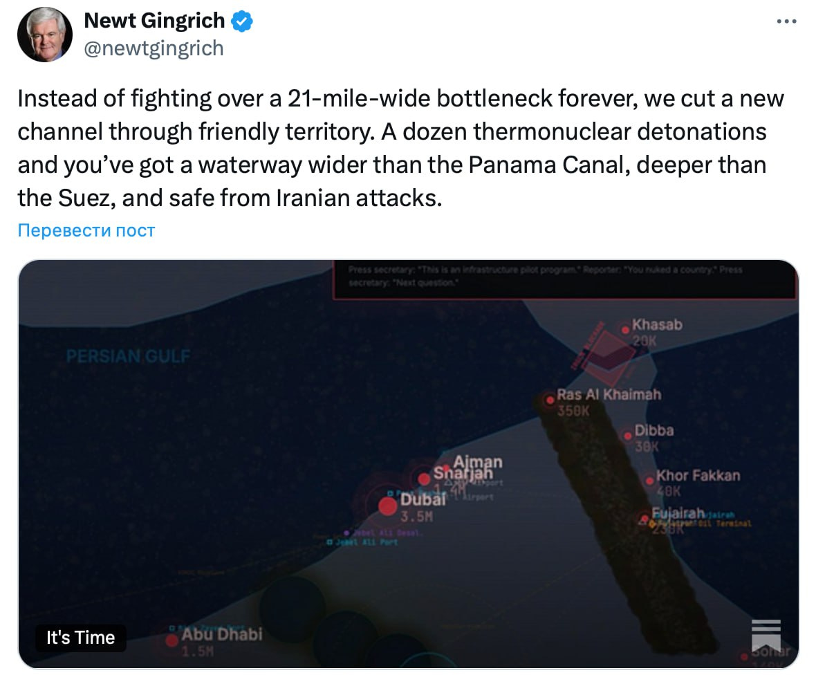 Newt Gingrich suggested solving the Hormuz problem with “12 thermonuclear explosions” to dig an alternative passage through “friendly territory”. Extra credits for creative use of nukes I’d give him that!