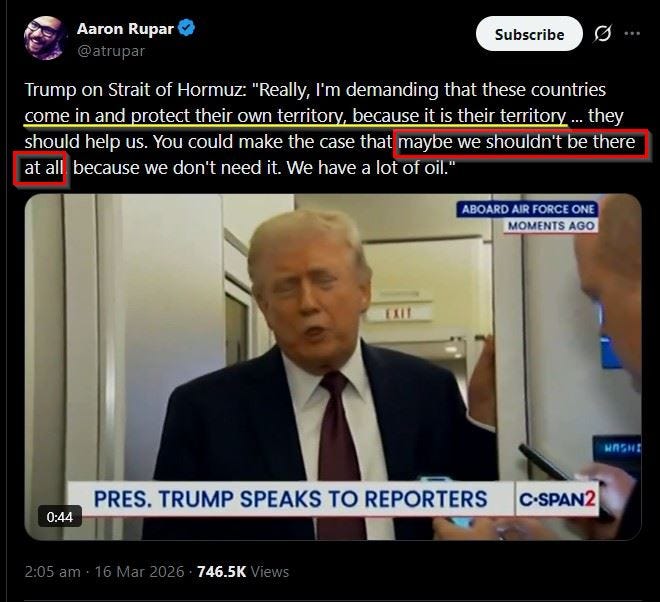 Australia said no. Germany’s Chancellor Merz made it official: “What does Trump expect from European frigates that the powerful American Navy cannot manage alone? It is not our war”. Estonia - Estonia! - wants Article 5 invoked first. Canada won’t participate in offensive operations. South Korea will “think about it”, which is diplomatic speak for no.