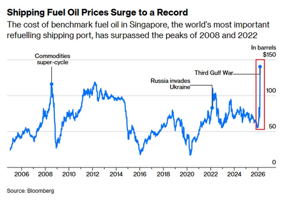 Meanwhile, in the physical world where actual barrels move on actual ships, Singapore fuel oil hit a record $140 per barrel. Up 146% since the war started. Kuwait’s oil output was halved - 1.3 million barrels a day, down from 2.6 million in February. UAE production fell to 2 million from 3.56 million. These aren’t simple export disruptions anymore. This is a full blown production collapse. Countries that can’t ship are running out of room to store what they pump.