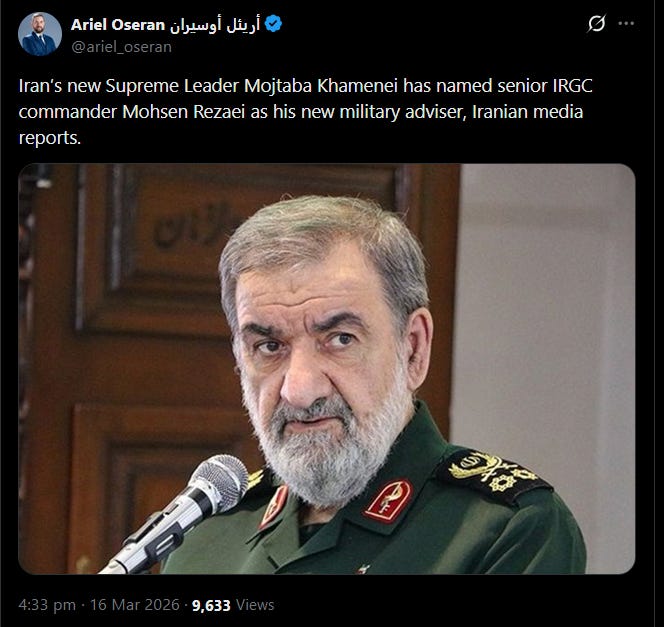 On the other side, the Supreme Leader nobody has seen appointed Mohsen Rezaee as his military adviser. Former IRGC commander, ran for president multiple times. 1st governance action from the invisible leader. Building a war cabinet from the shadows.