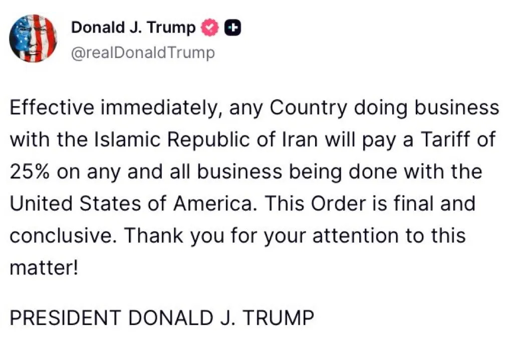 Trump announced it yesterday with his usual flair for the dramatic. “Effective immediately, any Country doing business with the Islamic Republic of Iran will pay a Tariff of 25% on any and all business being done with the United States of America.”