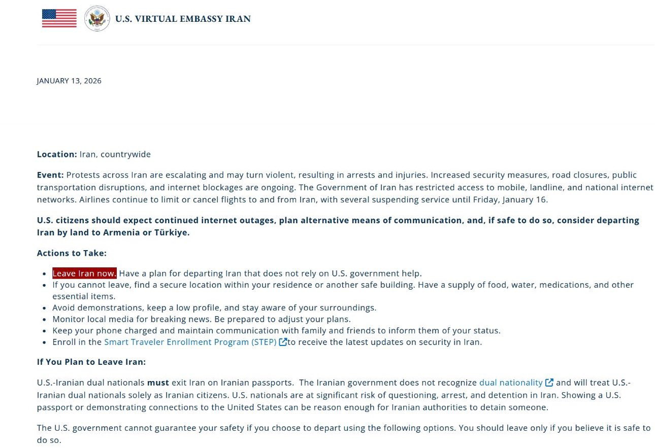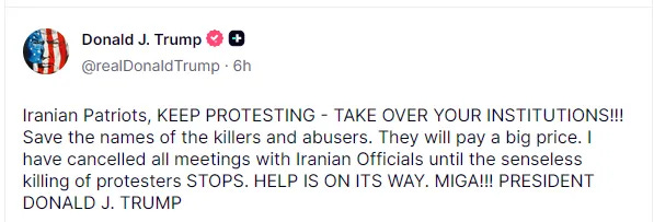 Supreme Court ruling on Trump’s tariff authority: January 14th. Trump issues Iran tariff: January 13th. 17h ago: The US embassy tells Americans in Iran to get out. Six hours ago, Trump posted another message directly to Iranian protesters: “KEEP PROTESTING - TAKE OVER YOUR INSTITUTIONS!!! [..] HELP IS ON ITS WAY.”