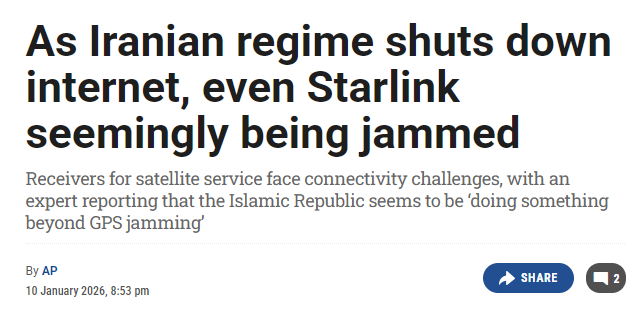 SpaceX activated free Starlink service at Trump’s request. Musk supposedly came through for the protesters. Except it doesn’t work. The 40,000-50,000 Starlink terminals scattered across Iran are largely useless now. Iran isn’t just jamming GPS signals. They’re using sophisticated mobile jammers that target the satellite uplink and downlink directly. Something beyond what Russia deployed in Ukraine. And unlike Ukraine, where SpaceX could push rapid software fixes, nothing’s coming for Iran.