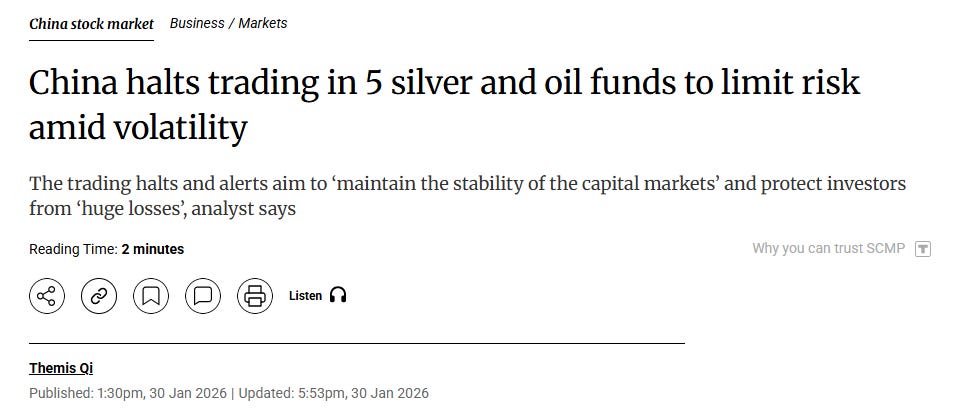 My money - and yes, literally, I bought SLV calls yesterday and I’m buying more today, not financial advice - is on some combination of theories two and three. Someone big is in trouble. The physical squeeze is real. The margin hikes are an attempt to take pressure off before something breaks completely. The China fund suspensions are Beijing protecting its own markets from Western contagion or vice versa.