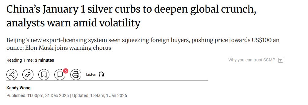 Look at the pattern. Silver is up 70% in January alone. Mining stocks are barely participating. Shanghai is diverging from the COMEX. Physical premiums are exploding across Asia. China is implementing export controls on January 1st that require exporters to prove they shipped metal annually from 2022 to 2024 and have production capacity over 80 tonnes. That’s not resource management. That’s a stranglehold.