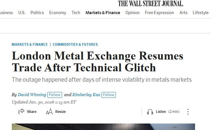 And then there are the whispers. Fitting the pattern perfectly. The LME encountering “temporary issues” - that wonderful euphemism exchanges use when prices are moving in directions they don’t like. HSBC also having “temporary issues”. All coincidentally happening during a 20% silver crash.