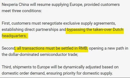 China didn’t just retaliate—they restructured the relationship entirely. According to new reports, if Nexperia wants to resume supplying Europe, three conditions apply: First, customers must renegotiate exclusive supply agreements, bypassing the seized Dutch headquarters entirely and establishing direct partnerships with China. Second, all transactions must be settled in RMB, opening a new path in the dollar-dominated semiconductor trade. Third, shipments to Europe will be dynamically adjusted based on domestic order demand, ensuring priority for domestic supply.