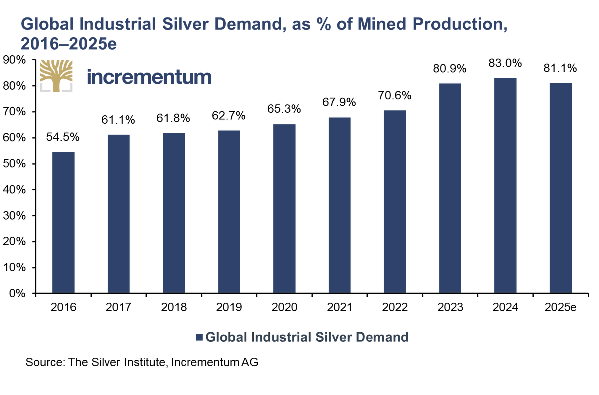 The numbers tell a story of structural transformation. Industrial demand has surged from 54.5% of mined supply in 2016 to a projected 81% in 2025, fundamentally rewiring silver's economic purpose. Solar panels alone consumed 197.6 million ounces in 2024, while the automotive sector uses 80-90 million ounces annually with electric vehicles requiring twice the silver content of traditional cars. The AI revolution adds another demand layer as semiconductors, data centers, and computing infrastructure all require silver-intensive technologies.