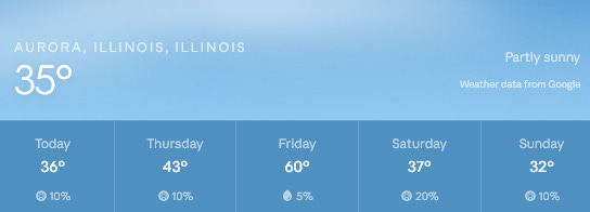 Yesterday’s forecast for Aurora: 35°F (2°C), partly sunny. Opening the door remains an option to cool things down.