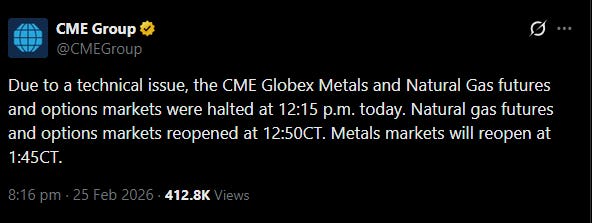 Funny thing though. When silver crashed 30% on January 30th - which I covered in “(Pet) rock, paper, scissors” - the circuit breakers didn’t trigger. No halts. No “technical issues”. The machine handled a 30% collapse in a single session without breaking a sweat. It’s apparently only upward price discovery that stresses the infrastructure.