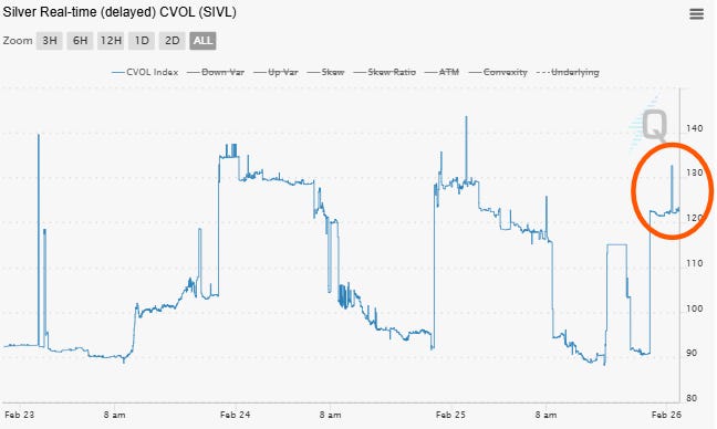 The SIVL - silver implied volatility - spiked to 130 during the session and then “normalized” back to 90 by close. Still historically elevated. Options market makers pricing in “something insane could happen at any moment” because they read the tea leaves. When the session ended without a visible explosion, they walked the fear gauge back down. Slightly.