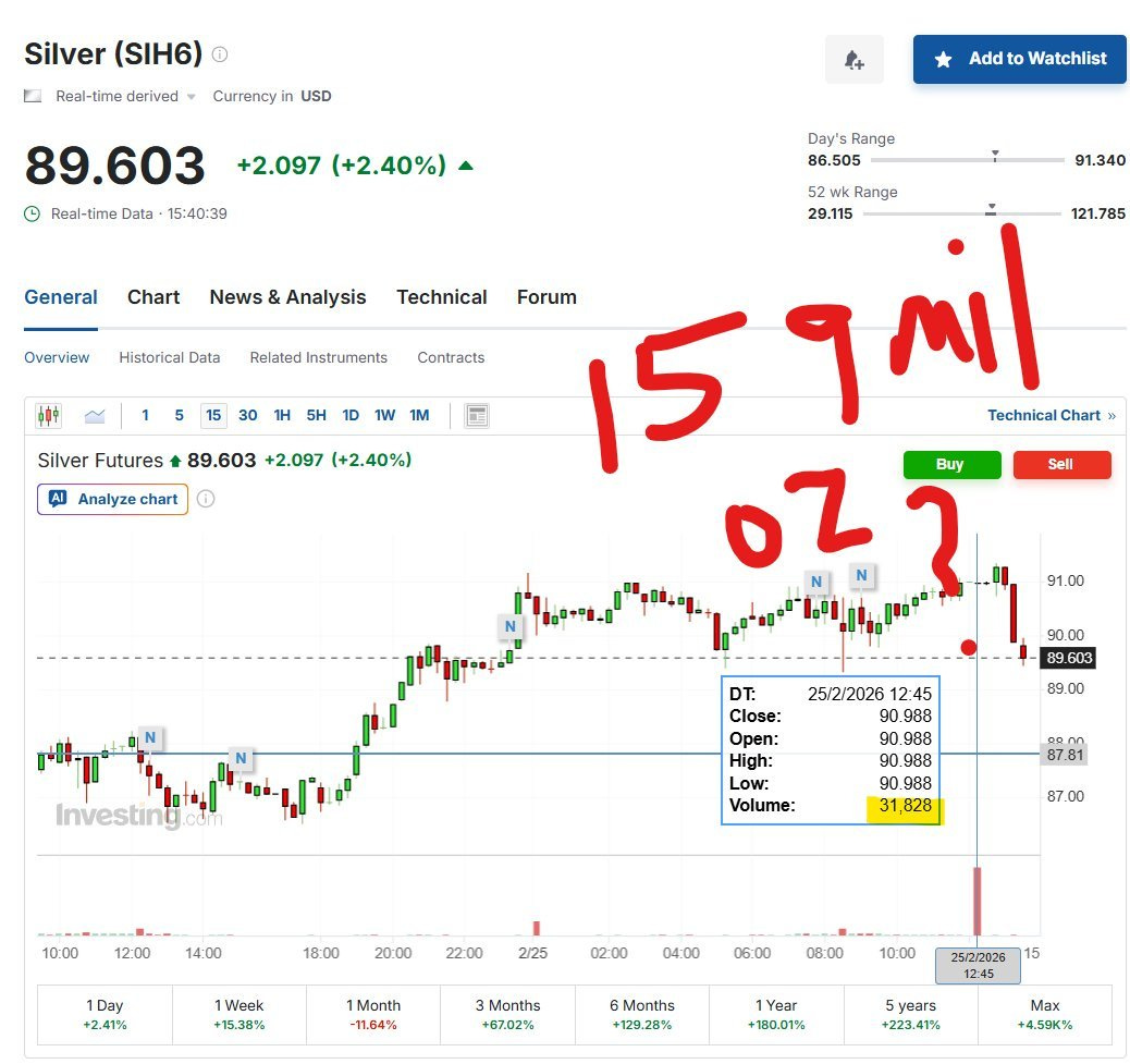 Silver opened at $89.4 yesterday and spent the entire morning doing what silver does when nobody’s actively sitting on it: going up. $89. $90. $91. Which is uncomfortably close to the level where the margin calls on short sellers stop being a nuisance and start being a near-death experience. The price where “bad quarter” becomes “I should call my lawyer”.