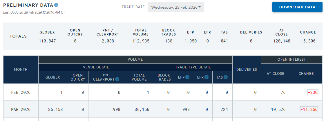 By end of day, March open interest had collapsed by 11,356 contracts in a single session. Cut in half. Which sounds like good news if you squint - pressure released, crisis averted, everyone goes home.