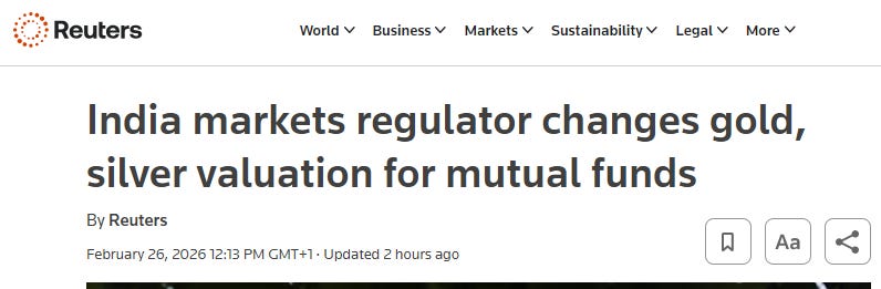 Just in: India's markets regulator SEBI quietly directed mutual funds to stop using LBMA prices for valuing physical gold and silver holdings, switching to domestic exchange prices from April 1st. One of the world's largest gold-consuming nations just decided London's price is no longer the relevant price.