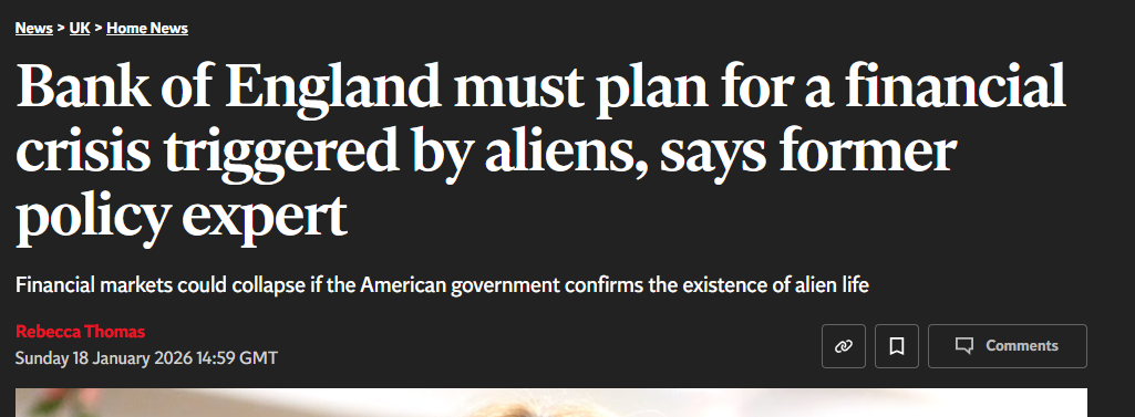 I couldn’t make this up even if I tried (ok ok ok… I probably could). Helen McCaw, a former senior analyst at the BoE, has written to Governor Andrew Bailey urging him to prepare contingency plans for a financial crisis triggered by... an official announcement confirming the existence of extraterrestrial life. She’s worried about “ontological shock”. About markets panicking when the White House admits that yes, we’re not alone, and yes, those things buzzing around restricted nuclear facilities aren’t ours and definitely aren’t Chinese or Russian drones.