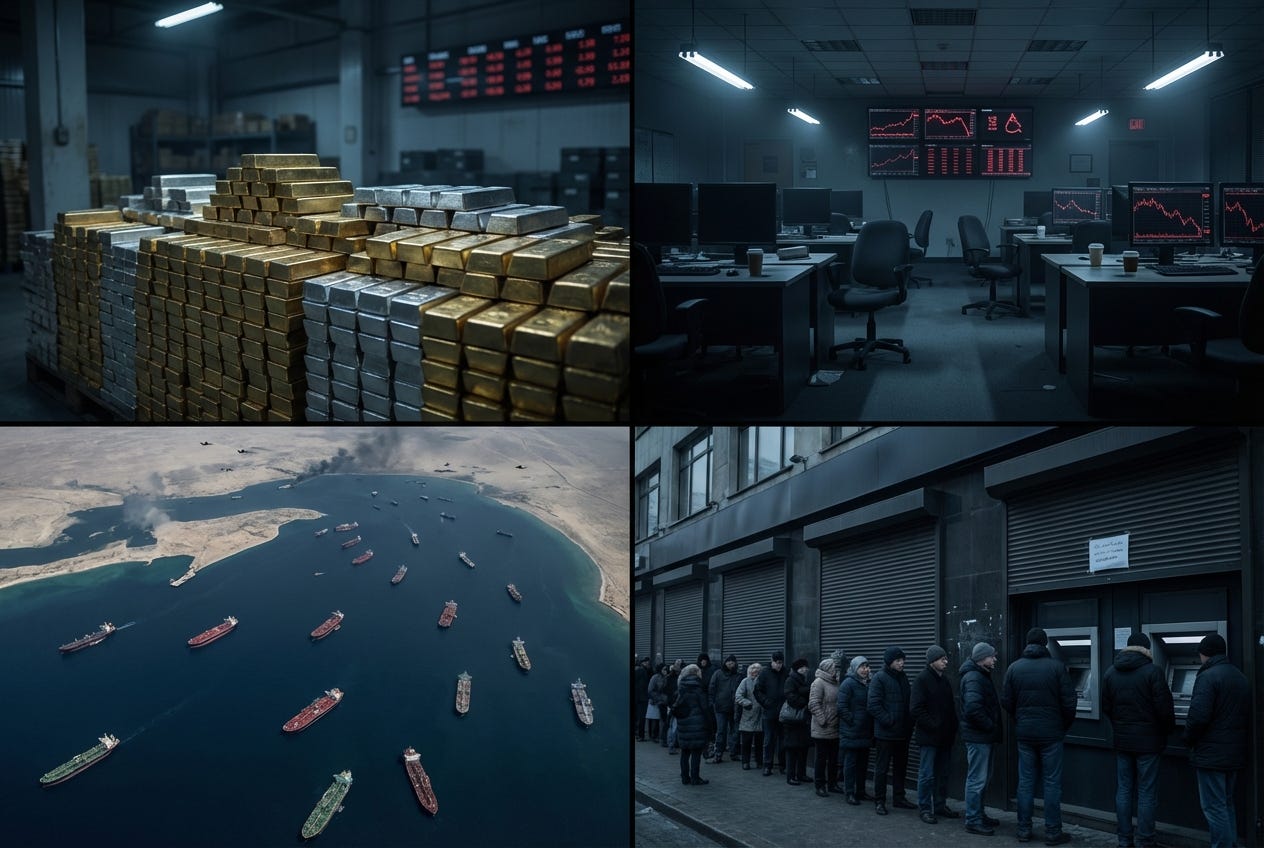 Silver’s industrial demand is roughly 70% of annual consumption. Solar panels. Electronics. Medical equipment. None of that gets manufactured when the global economy seizes rather than wobbles. The safe haven bid and the industrial demand collapse happen simultaneously, pulling in opposite directions, and nobody has a clean answer to which one wins. The Hormuz closure that comes with any serious escalation takes 20% of global oil supply offline immediately - energy costs spike across every supply chain at once. Copper collapses as the industrial bellwether for a world economy in freefall. Wheat spikes as Black Sea and Middle East disruption compound simultaneously. China, watching all of this, restricts rare earth exports - because there is no crisis China won’t use strategically. And if the war comes home to a major US city, the question isn’t which way silver moves. The question is whether you can access it at all.
