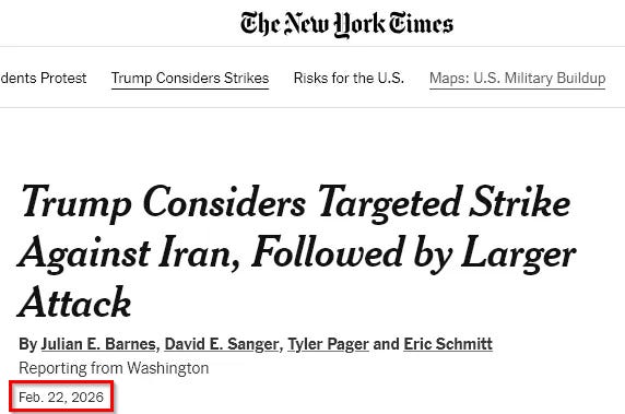 The New York Times reported earlier that Trump has told advisers he is leaning toward an initial limited strike intended to demonstrate resolve, with a much larger decapitation campaign to follow later in the year if Iran doesn’t capitulate. To back this threat, Trump has concentrated 40-50% of deployable US air power in the region. Two stages, with an indefinite escalation ladder above that.