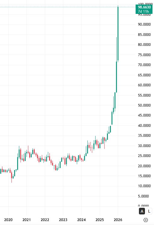 When silver goes from $98 to $150 or $200, miners won’t move 50%. They’ll move 200-300%. That’s leverage. Bank of America targets $110 by H2 2026. Citigroup says $100 by March. Major institutions finally admitting what’s underway because they can’t ignore it any longer.
