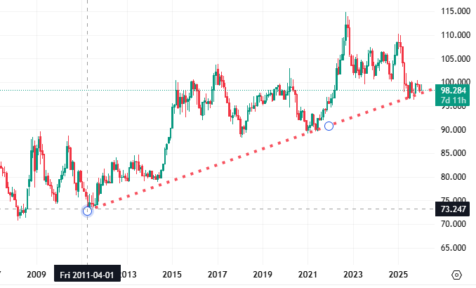 The dollar itself is breaking down technically. The DXY monthly chart shows 15-year support from the 2011 uptrend cracking under pressure after bleeding from 110 to 98 over the past year. As I see it, a potential break of the 15-year support is coming. This would have major macro implications. The graph just confirms my gut feeling about the macro-setup. But it’ll give the move extra impetus, because when the world’s reserve currency breaks this multi-decade technical support, everything priced in that currency reprices. (Just see what silver did after breaking a 45 year cup/handle support). This isn’t just about that chart pattern. More importantly, it’s what happens when the flows that supported the dollar reverse.