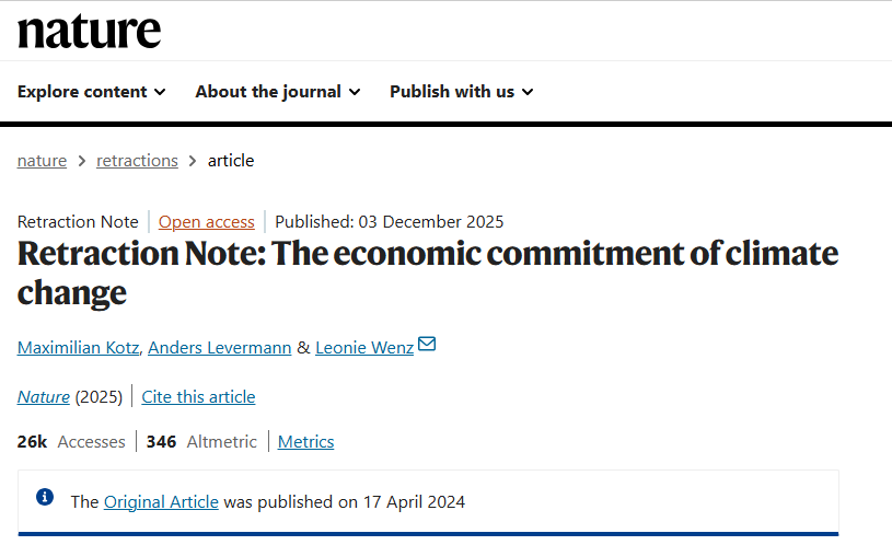 Or take climate change. Just this week, Nature - one of the most prestigious scientific journals - retracted a major 2024 study that predicted catastrophic economic collapse from climate change. The paper claimed climate damage would cost $38 trillion annually by 2049, a 19% drop in global income by 2050. It was cited by the World Bank, the OECD, central banks worldwide. Used to justify massive policy shifts and spending programs. Bloomberg, CNN, Forbes - they all amplified it.