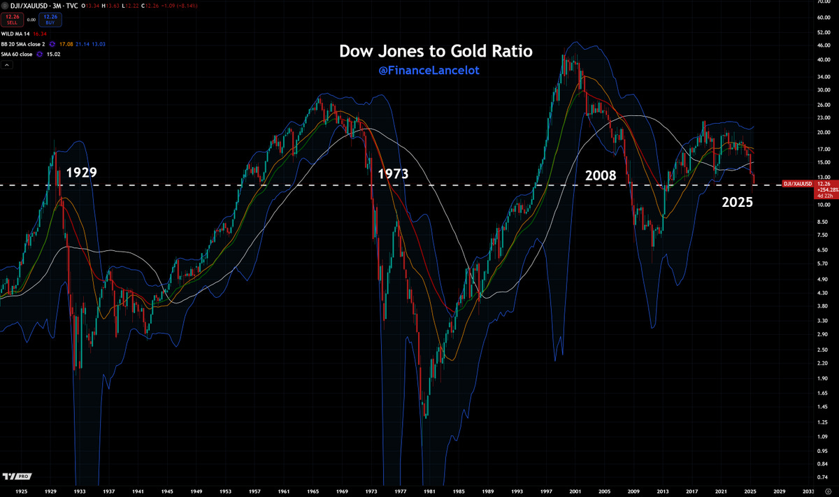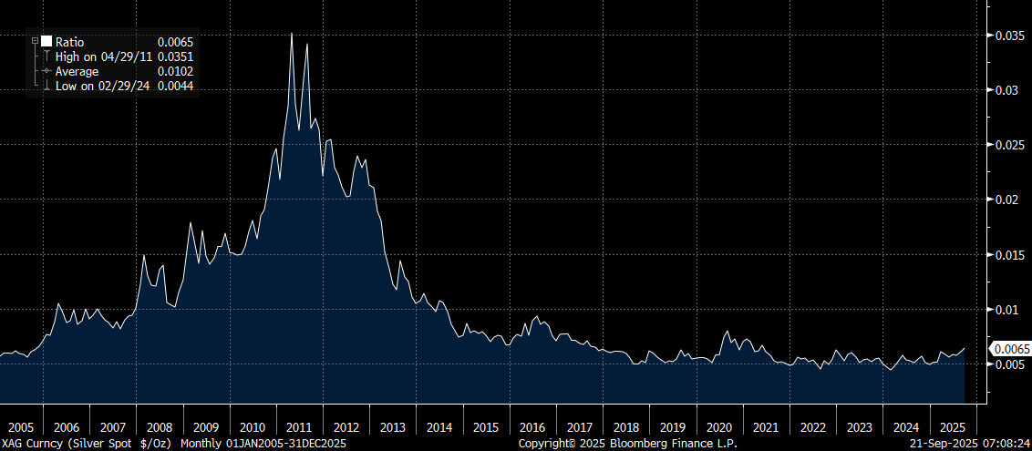 Silver/SPX (0.035 in 2011). Now stands at 0.0065. At current S&P prices: 230/oz is possible. Or silver doesn’t move, and S&P crashes to 1200. That’s the same ratio too.