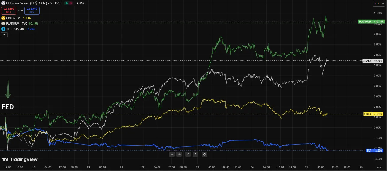 Reaction of different markets to the FED decision to lower the interest rates (from top to bottom: Platinum - Silver - Gold - Bonds):
