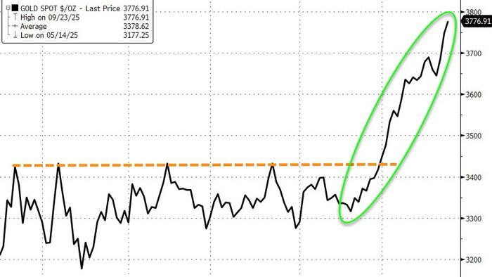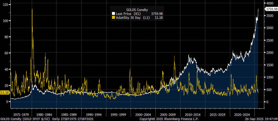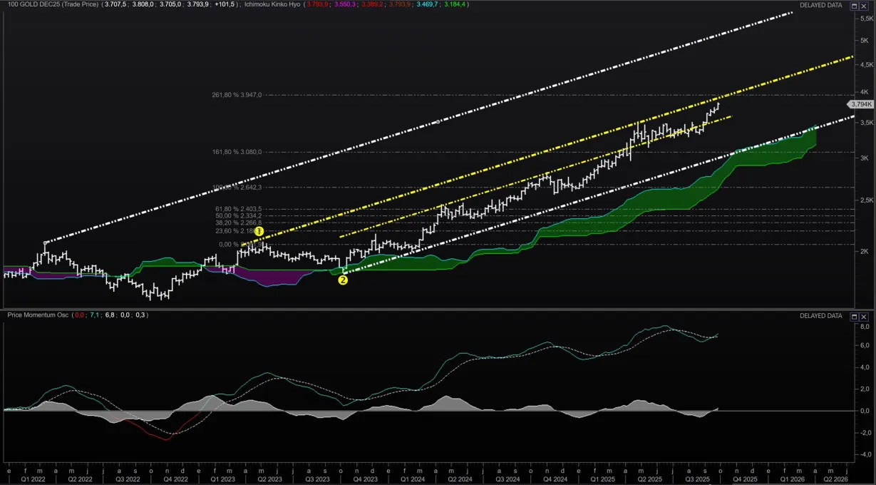 Gold threatening the middle band of this channel. Could get technically slammed down to around 3000 without loosing it’s bull-market. And providing anyone listening for a nice entry point.