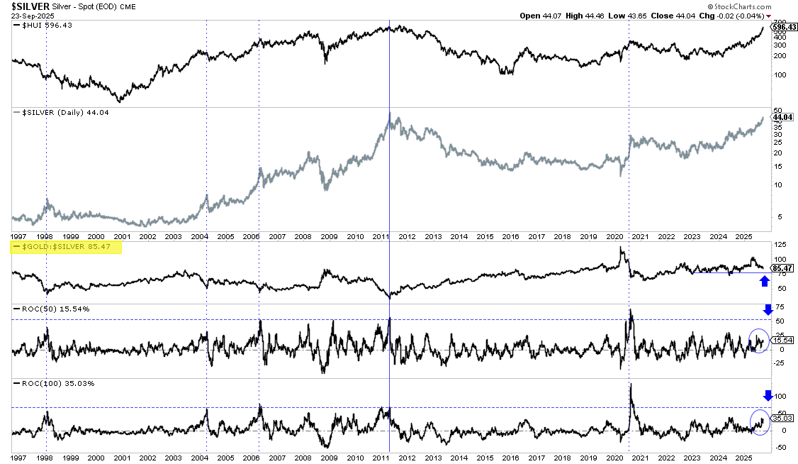 Silver’s Rate of Change (ROC) is nowhere near past (intermediary) peaks (2004, 2006). But things can move suddenly in such a tiny market when money floods in.