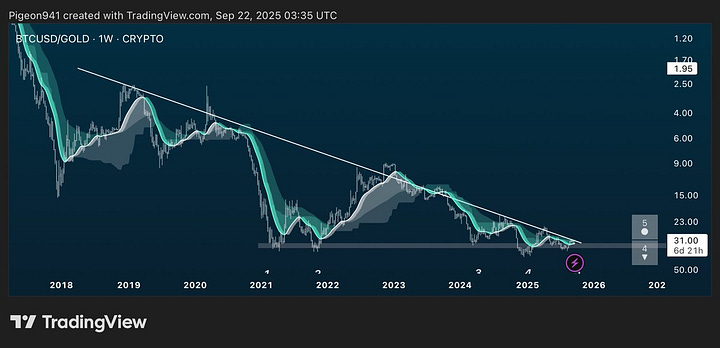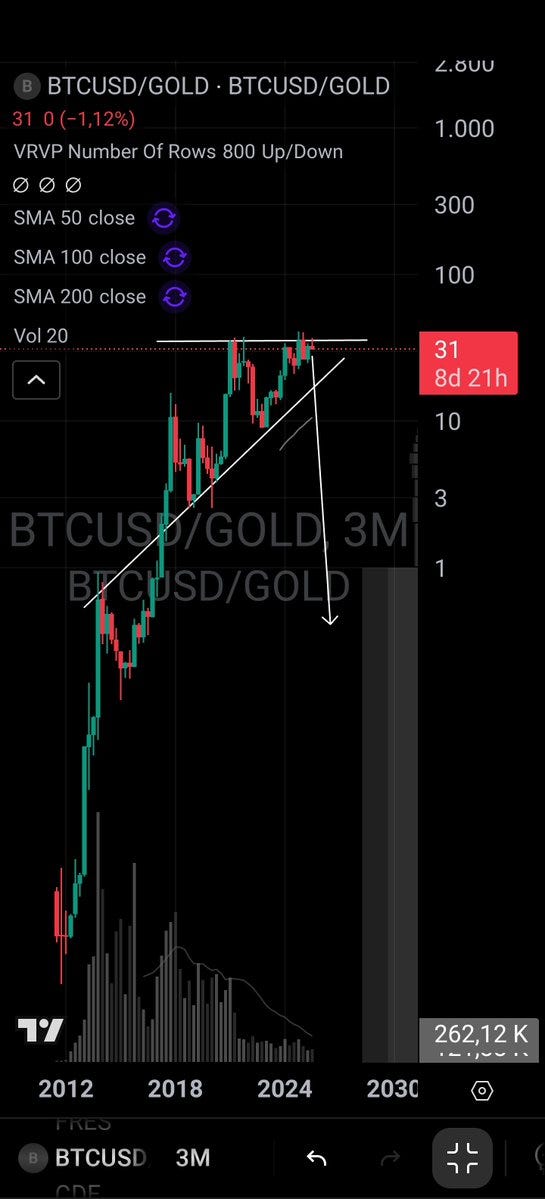 BTC vs Gold. Which is right? BTC bottoming or topping? My view is the latter.
