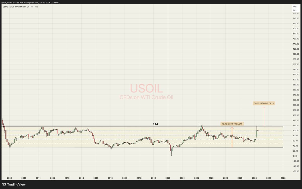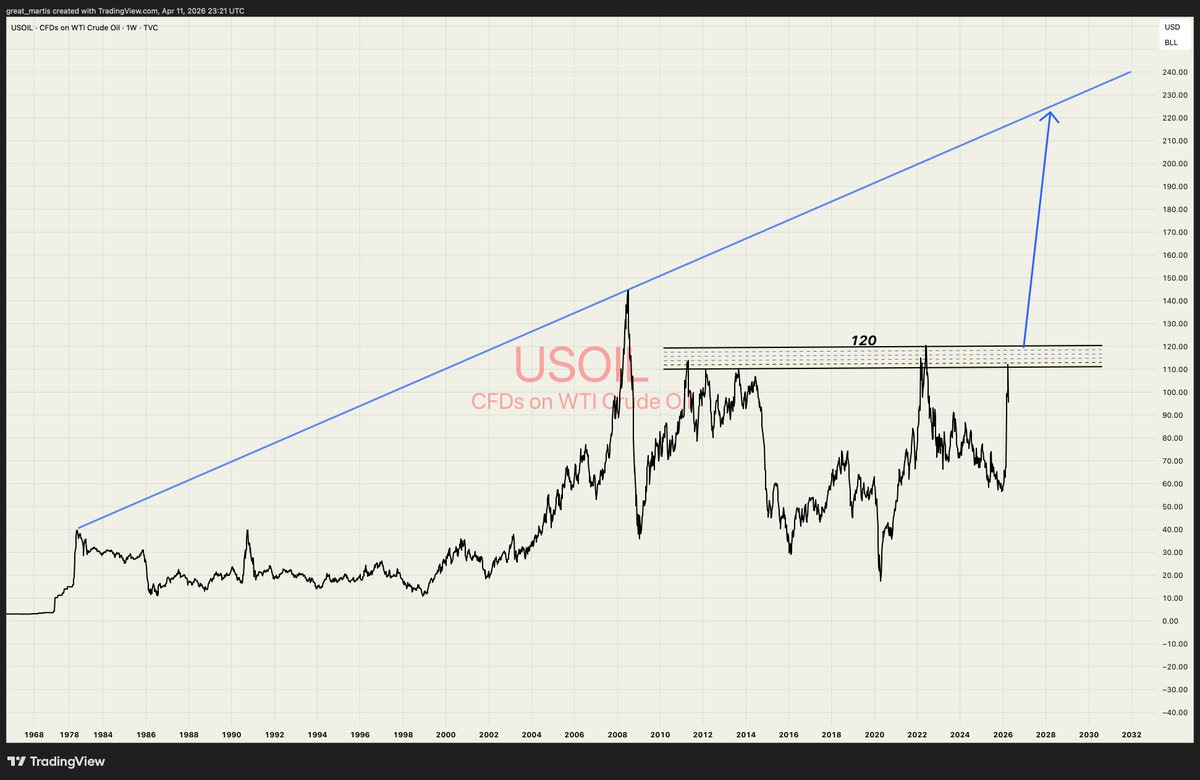 Oil's 50-year trendline chart — let’s see when shit starts to hit the fan: