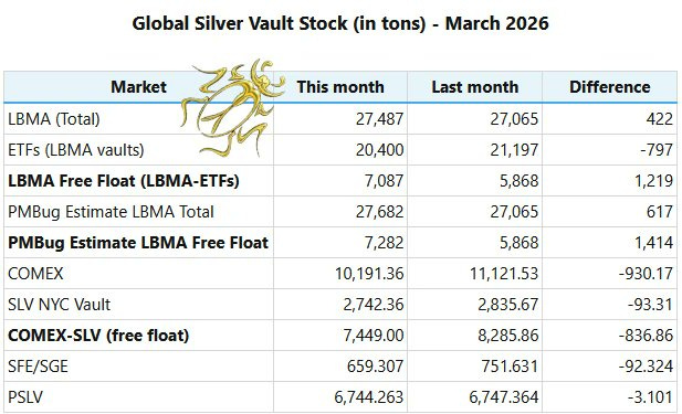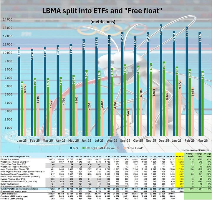 LBMA silver vault total stock and free float chart showing the split between eligible and encumbered inventory.